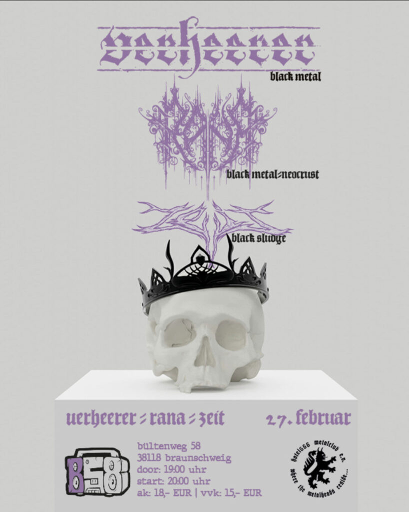 Jetzt kippt hotel666 die Stimmung und führt euch in die düsteren Gefilde des Black- und Sludge-Metal. Mit VERHEERER , RANA und ZEIT zieht ein dunkles Gewitter über die Bühne des beschaulichen B58.